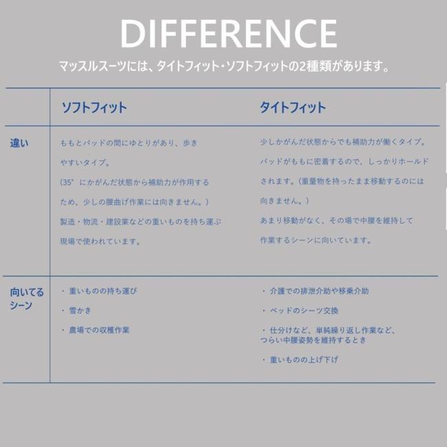 ◆メーカー:イノフィス◆品名:マッスルスーツEvery タイトフィット ML◆品番:MS08-ML-T0-0000-A(MS08MLT00000A)◆タイプ:タイトフィット◆サイズ :適用身長(推奨)・M-Lサイズ:160cm?185cm◆本体重量 :3.8kg ※カバー含まず◆駆動源 :圧縮空気◆アクチュエータ :McKibben型人工筋肉◆圧縮空気供給方法 :手動式空気入れ◆補助力 :25.5kgf(100Nm)◆使用環境温度 :-30℃?50℃◆防塵・防水性能(保護等級) :IP56◆本体寸法:高さ×幅×奥行・M-Lサイズ:840mm/465mm/170mm◆メーカー保証期間 :6ヶ月/購入後1ヶ月以内の製品登録にて1年に延長◆少しかがんだ状態からでも補助力が働くタイプ。パッドがももに密着するので、しっかりホールドされます。(重量物を持ったまま移動するのには向きません。)あまり移動がなく、その場で中腰を維持して作業するシーンに向いています。◆向いているシーン・ 介護での排泄介助や移乗介助・ ベッドのシーツ交換・ 仕分けなど、単純繰り返し作業など、つらい中腰姿勢を維持するとき・ 重いものの上げ下げ