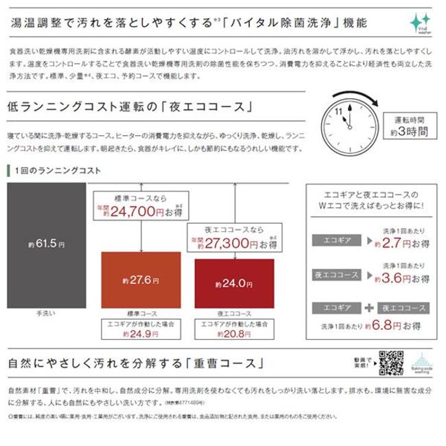 | 運転コース | 標準 重曹 念入り 少量(時短) 夜エコ 予約 サイレント 乾燥 クリーンキープ 庫内洗浄 | 運転時間目安(標準) | 給湯60℃:約124分 給湯20℃:約152分 |