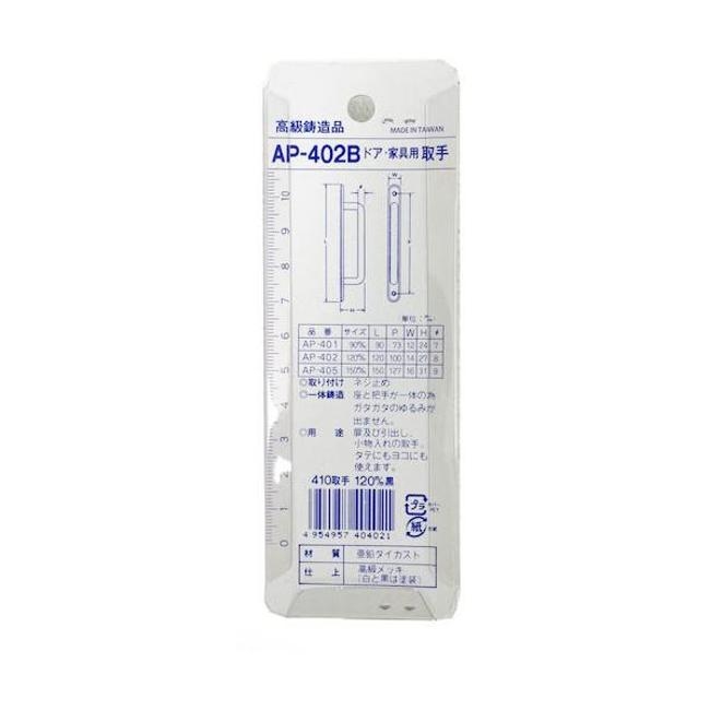 【商品説明】 木ネジタイプ 取手にあいた穴を使って表側から木ネジで固定する 【仕様】 取付:表木ネジ止 取っ手 【サイズ】 120mm 【カラー】 黒 【入数】 1 AP402B