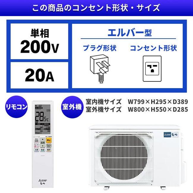 | 室内機サイズ | 幅799x高さ295x奥行389(394)mm ()内の寸法は、据付板を付けたときの寸法です。 | 室外機サイズ | 幅800(+62)x高さ550x奥行285(+60)mm ()内の寸法は、サービスパネルおよび脚部の突出し寸法です。 |
