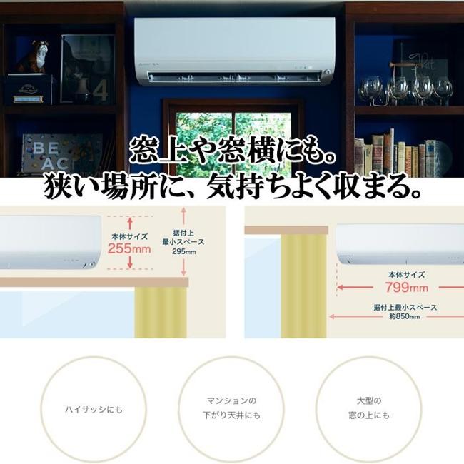 | 室内機サイズ | 幅799x高さ255x奥行338(343)mm ()内の寸法は、据付板を付けたときの寸法です。 | 室外機サイズ | 幅699(+56)x高さ538x奥行249(+36)mm ()内の寸法は、サービスパネルおよび脚部の突出し寸法です。 |