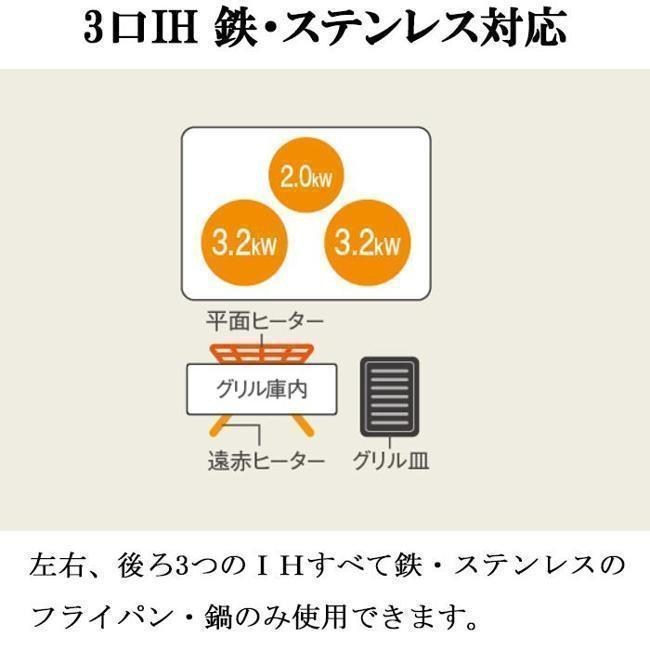 | 火力調整 | 左右IH:10段階 後ろIH:8段階 グリル(手動):3段階 | クイックラジエントヒーター | |