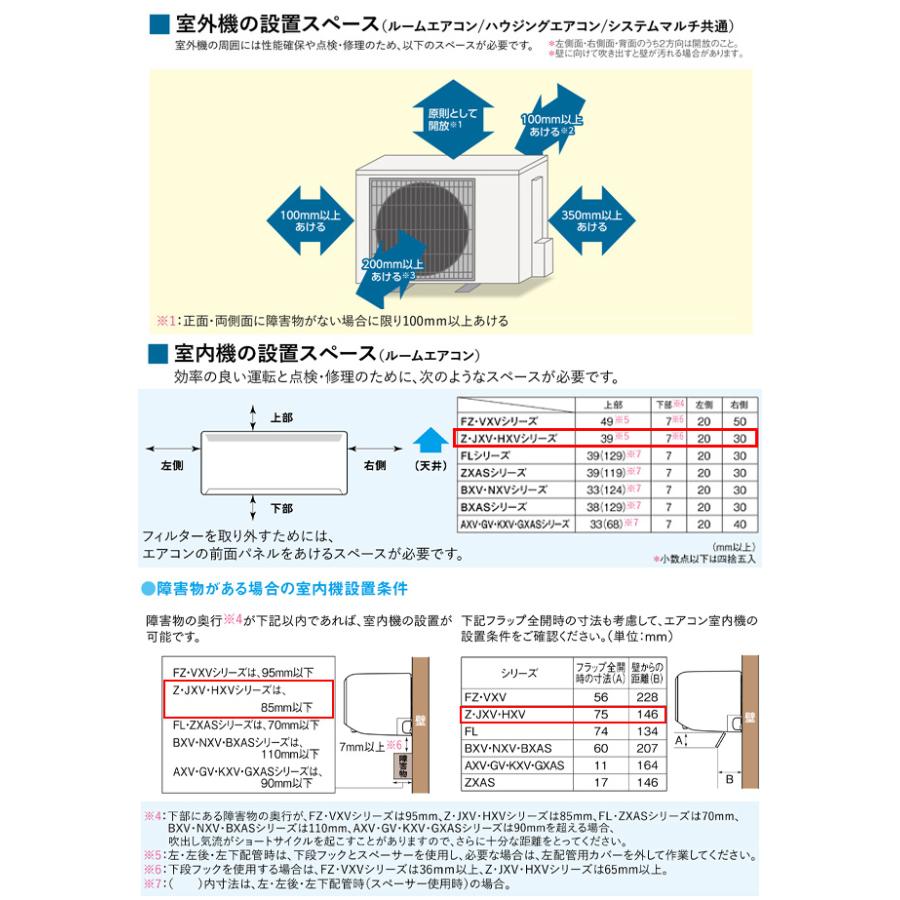 | 室内機サイズ | 幅799x高さ295x奥行389(394)mm ()内の寸法は、据付板を付けたときの寸法です。 | 室外機サイズ | 幅800(+62)x高さ714x奥行285(+60)mm ()内の寸法は、サービスパネルおよび脚部の突出し寸法です。 |