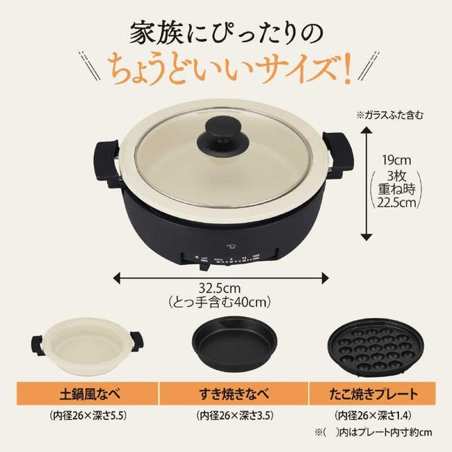 【品名】グリルなべ あじまる 3枚タイプ【品番】EP-FS30-BA(ブラック)【商品特長】●「土鍋風なべ」「たこ焼きプレート」「すき焼きなべ」の3枚タイプ。「土鍋風なべ」 食材やだしの色が映える土鍋風なべ。直火OKなので下ごしらえにも便利にお使いいただけます。「たこ焼きプレート」 穴からあふれた材料も丸く作りやすい、区切り線つき。直径40mmのたこ焼きが21個焼けます。「すき焼きなべ」 お好み焼きや焼肉はもちろん、深さが3.5cmあるのですき焼きにもぴったり。自宅で本格的な焼きものを楽しめます。●ヒーターセットが簡単に取り外せるので、土鍋風なべはもちろん、本体ガードまで、気になる汚れをすっきりお手入れできます。●火力表示がシンプルな炎のピクトでわかりやすく、火力調節もスライド式で無段階に設定できます。●2.5mロングコードで、キッチンや食卓でも「届かない…!」といったストレスなく使っていただけます。●本体ガードがプレートのふちより高いから、熱いプレートに触れにくい安心設計です。※たこ焼きプレート、すき焼きなべ使用時のみ●マグネットプラグで、万が一、手や足を引っかけてもすぐに外れる安心設計です。