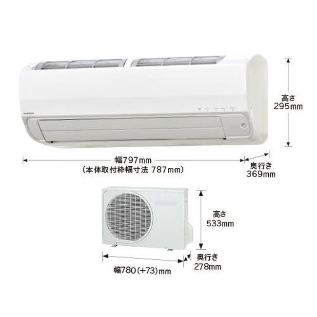 | 室内機サイズ | 幅797x高さ295x奥行369mm | 室外機サイズ | 幅780(+73)x高さ533x奥行278mm |